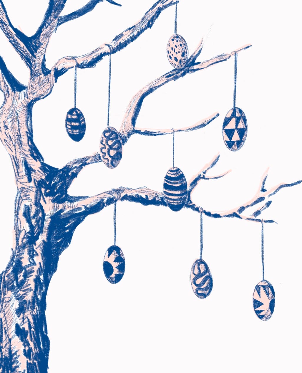 Somewhere flower crowns are being fashioned. A grandmother is showing her granddaughters how to twine the stalks of the plants together and how to space them so that there are leaves and flowers in clustering lines through the whole garland. Folk songs are hummed and passed along the line as the children and their mother hang delicate tree branches with gilded eggs. Light passes through the window in a pleasing beam onto the wooden floor, it catches the shine of the eggs as they gently rock to the vibrations of the people big and small, moving about this little house. An aromatic fruit cake is being covered in marzipan, later to be glazed in syrupy apricot.